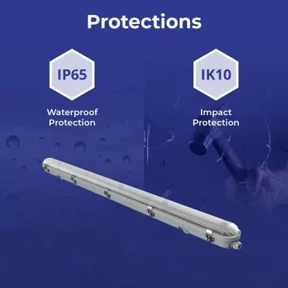 Questo apparecchio può essere usato sia in spazi interni che in spazi esterni, poiché ha indice di protezione contro l'ingresso di acqua e polvere IP65. In generale, un apparecchio con IP44 è resistente a schizzi di acqua e umidità, e può quindi essere installato in spazi esterni molto umidi o esterni riparati, come sono una tettoia. Un apparecchio che invece verrà esposto a intensi getti di acqua deve avere almeno IP54. Questa lampada ha anche un indice di resistenza a urti e impatti di IK10 - 20 Joule.