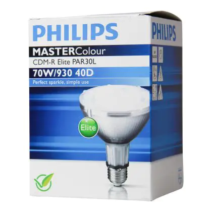 Le Philips CDM-R Elite 70W 930 E27 PAR30L 40D (MASTERColour) sono lampade a scarica compatte ad alogenuri metallici in ceramica dotate di riflettore. Sono lampade estremamente efficienti che presentano una potenza di 70W e sono dotate di attacco del tipo E27. Queste lampade a scarica compatte hanno una vita media di 15.000 ore. La resa dei colori delle Philips CDM-R Elite 70W 930 E27 PAR30L 40D (MASTERColour) é eccezionale grazie all'indice di resa cromatica di 90-100Ra: questo sta ad indicare che le caratteristiche degli oggetti illuminati sono poste in risalto in maniera ottimale.